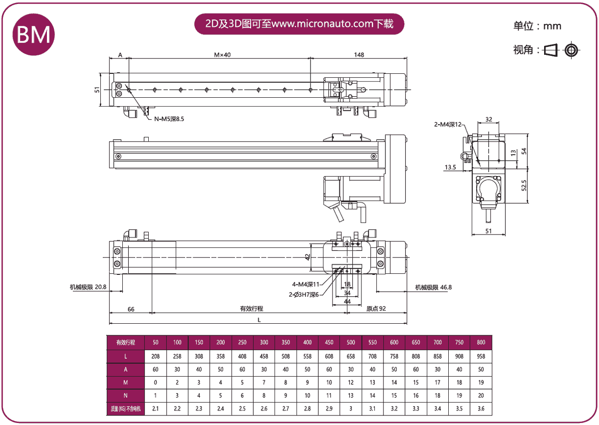 標(biāo)準(zhǔn)有效行程: 100~800mm(間隔50mm)
