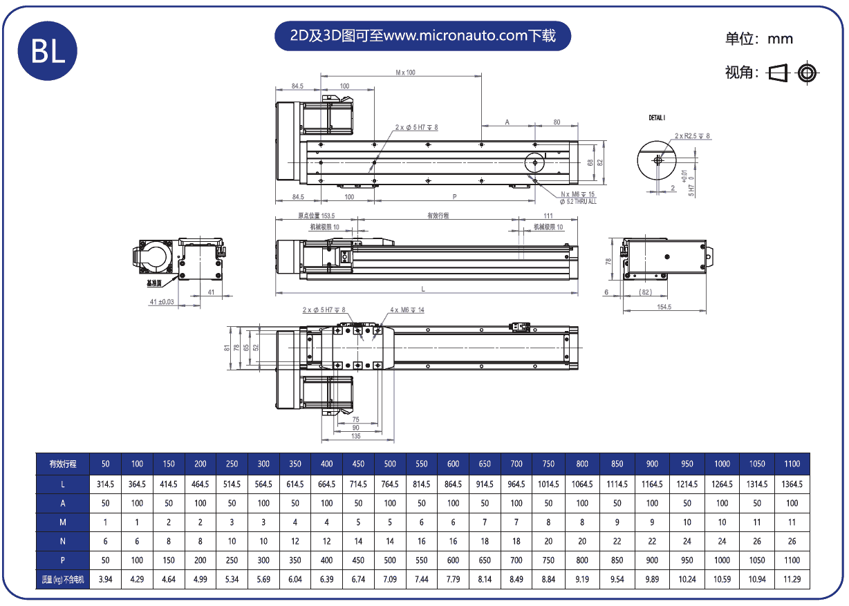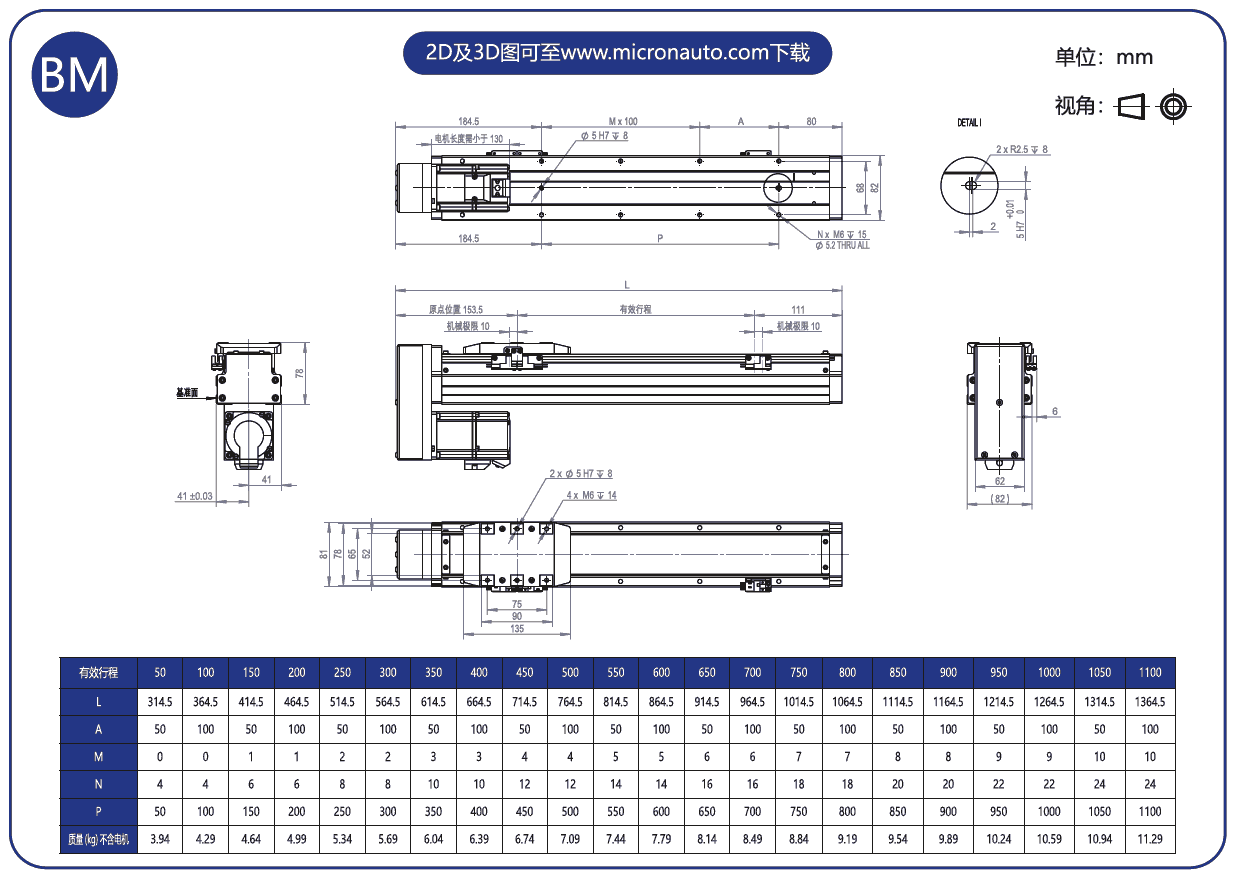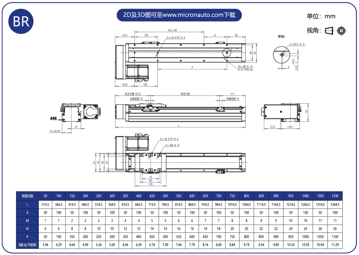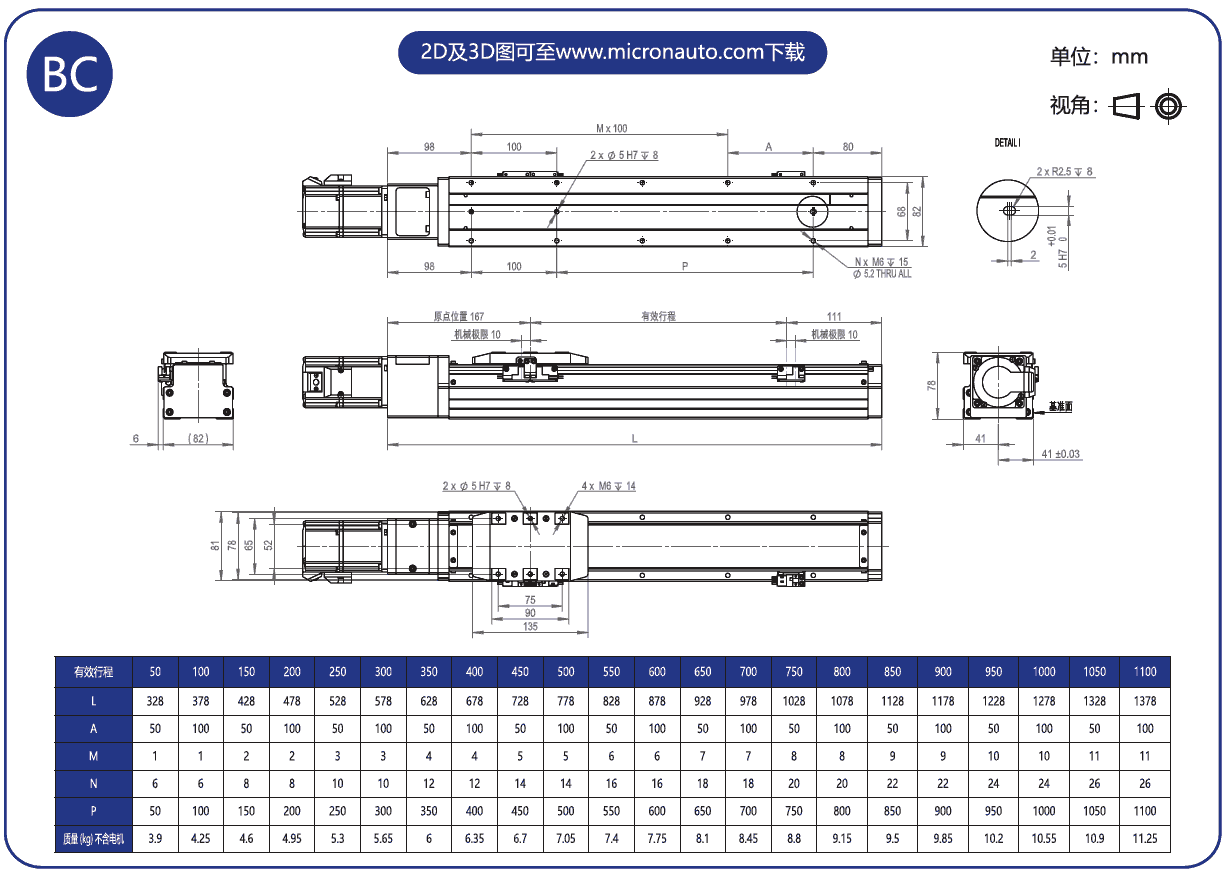 標(biāo)準(zhǔn)有效行程: 50~1100mm(間隔50mm)