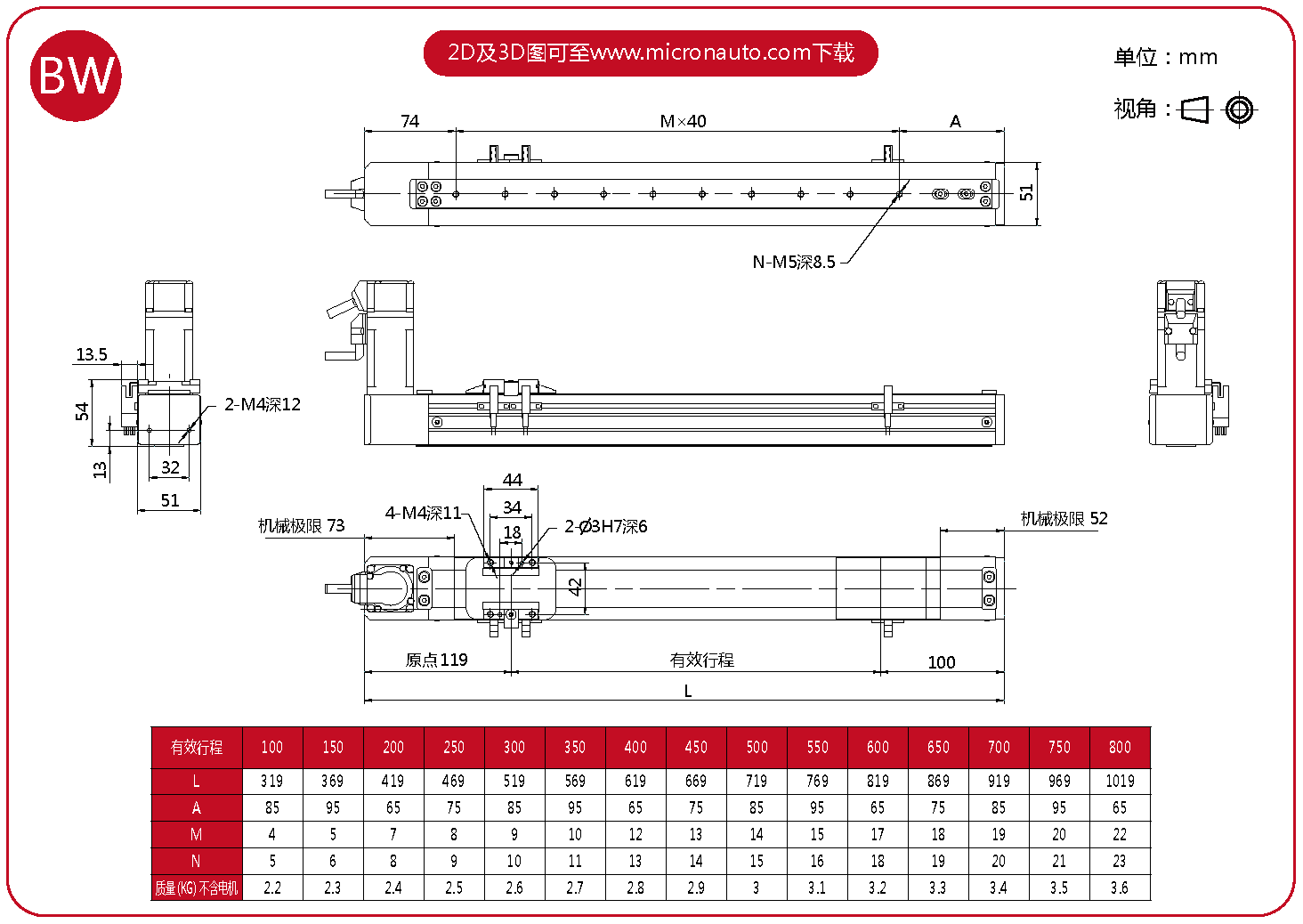標(biāo)準(zhǔn)有效行程: 100~800mm(間隔50mm)